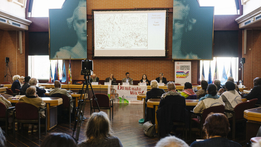 “Le sujet devrait être au cœur des préoccupations politiques : le monde se réarme, et la paix ne fait plus partie du vocabulaire politique”, a d’emblée lancé Nathalie Séguin, membre de la CGT. Le ton est donné, pour cette deuxième édition de la Conférence internationale pour la paix, organisée par la Ville les 10 et 11 octobre derniers autour autour des liens entre écologie, paix et enjeux mondiaux.