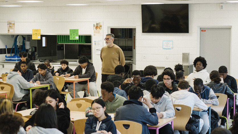 Dans le réfectoire du collège Jean-Perrin, les élèves sont penchés sur leur feuille, stylo à la main, silencieux et concentrés. Les quatre classes de troisième participent à « la dictée géante », une initiative proposée par Rachid Santaki, surnommé « Monsieur Dictée » pour organiser régulièrement des dictées géantes. Alors qu’il passe entre les rangées, lisant à haute voix un extrait de La Force de l’âge de Simone de Beauvoir, certains jettent un regard vers leurs voisins. Ici, pas de note, pas d’enjeu scolaire, si ce n’est l’exigence d’écouter avec attention.