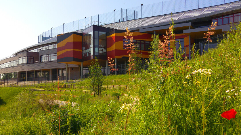 À Vitry, on doit à Monique Labbé les nouveaux locaux du collège Monod, un projet construit en concertation avec l’équipe pédagogique et les élèves. Façonné par la morphologie du terrain à flanc de coteau, par le passage de l’eau en souterrain et une histoire commençant à l’âge de bronze, le bâtiment épouse en souplesse les courbes de niveau tout en respectant le tissu pavillonnaire du quartier où il est implanté. Il est très compact, économe en emprise au sol pour préserver des espaces extérieurs et, grâce à l’environnementaliste Isabelle Hurpy, favoriser l’écoulement et l’infiltration des eaux, de pluie en particulier, dans ce terrain très pentu. Ainsi, le plateau sportif de plein air se pose-t-il sur le bâtiment, et les parkings s’installent-ils en sous-sol, dans les vides laissés par les fouilles archéologiques. Pour préserver le voisinage, le gymnase est installé au cœur du collège et éclairé naturellement par un large patio où est planté un olivier tricentenaire. L’architecte a préservé les vestiges retrouvés devant le bâtiment, d’autres ont été recueillis par les enseignants et installés dans le hall.