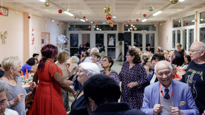 Michelle, assise à côté de sa maman, résidente de 80 ans, est venue avec ses enfants et son petit-fils, soit au total quatre générations réunies pour cette soirée. « Je travaille aussi avec les personnes âgées, et c’est super de ne pas les oublier, de les voir heureuses », précise-t-elle, en regardant des résidents se déhancher sur la piste de danse aux sons d’un DJ qui reprend au micro les grands tubes de la chanson française.