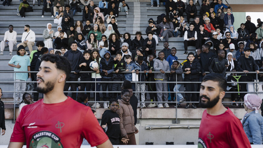 Ce 20 avril, le stade Gabriel-Péri est paré aux couleurs de la Palestine. Les drapeaux flottent au vent, tandis que l’odeur des snacks embaume le site. Les tribunes, elles, se remplissent. Enfants, jeunes et adultes de Vitry ou venus de Gaza s’amusent et discutent dans une ambiance bon enfant.