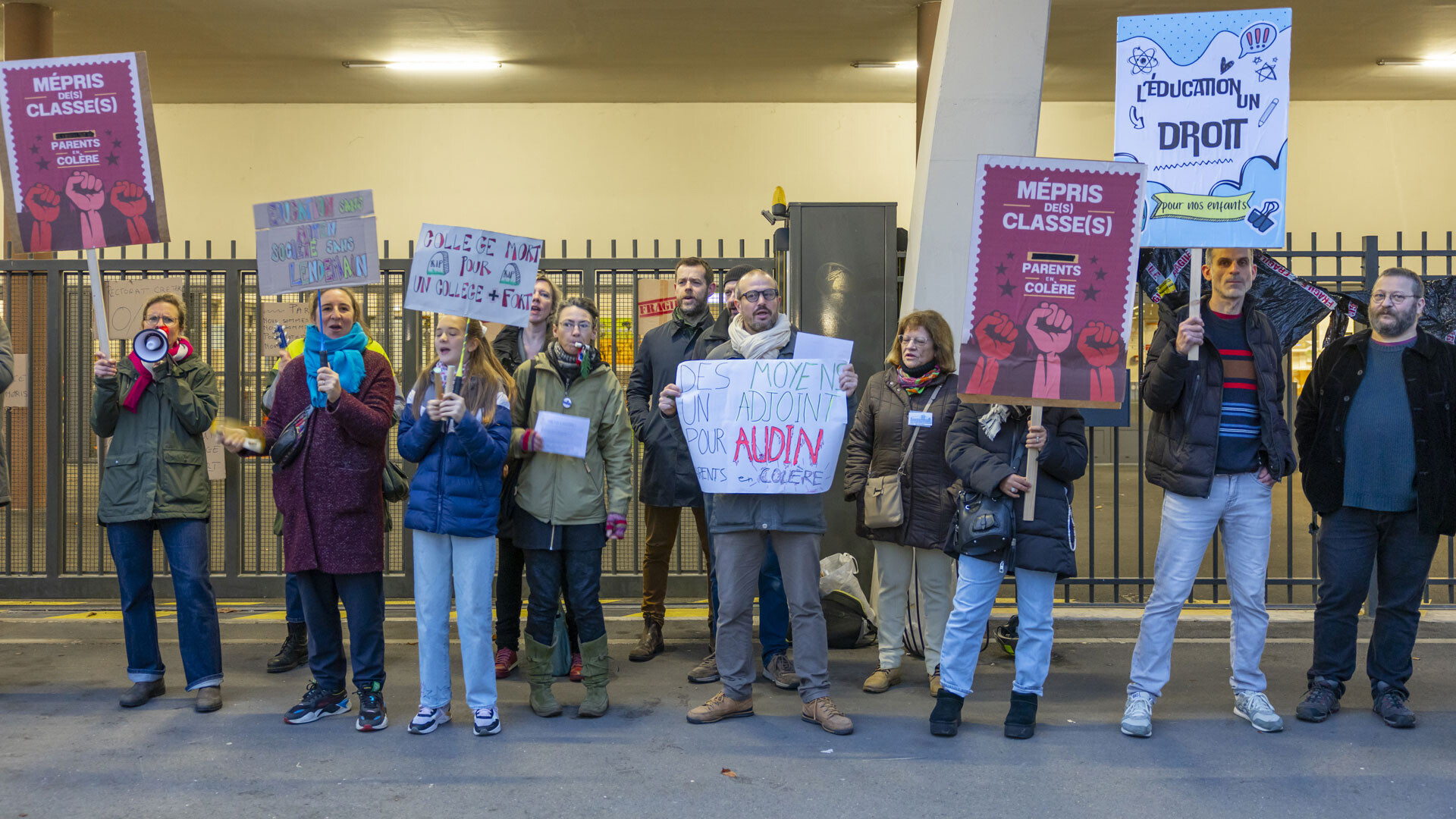 Le mercredi 27 novembre, au collège Josette-et-Maurice-Audin, enfants et parents se rassemblent devant le portail, où la majorité des élèves ne se rendra pas en cours. “Le collège est mort”, affichent plusieurs panneaux. Les raisons de cette mobilisation incluent le manque de personnel administratif, d’AESH (accompagnants des élèves en situation de handicap) et le nombre élevé de professeurs absents non remplacés. Delphine, représentante de parents d’élèves à la FCPE, souligne :