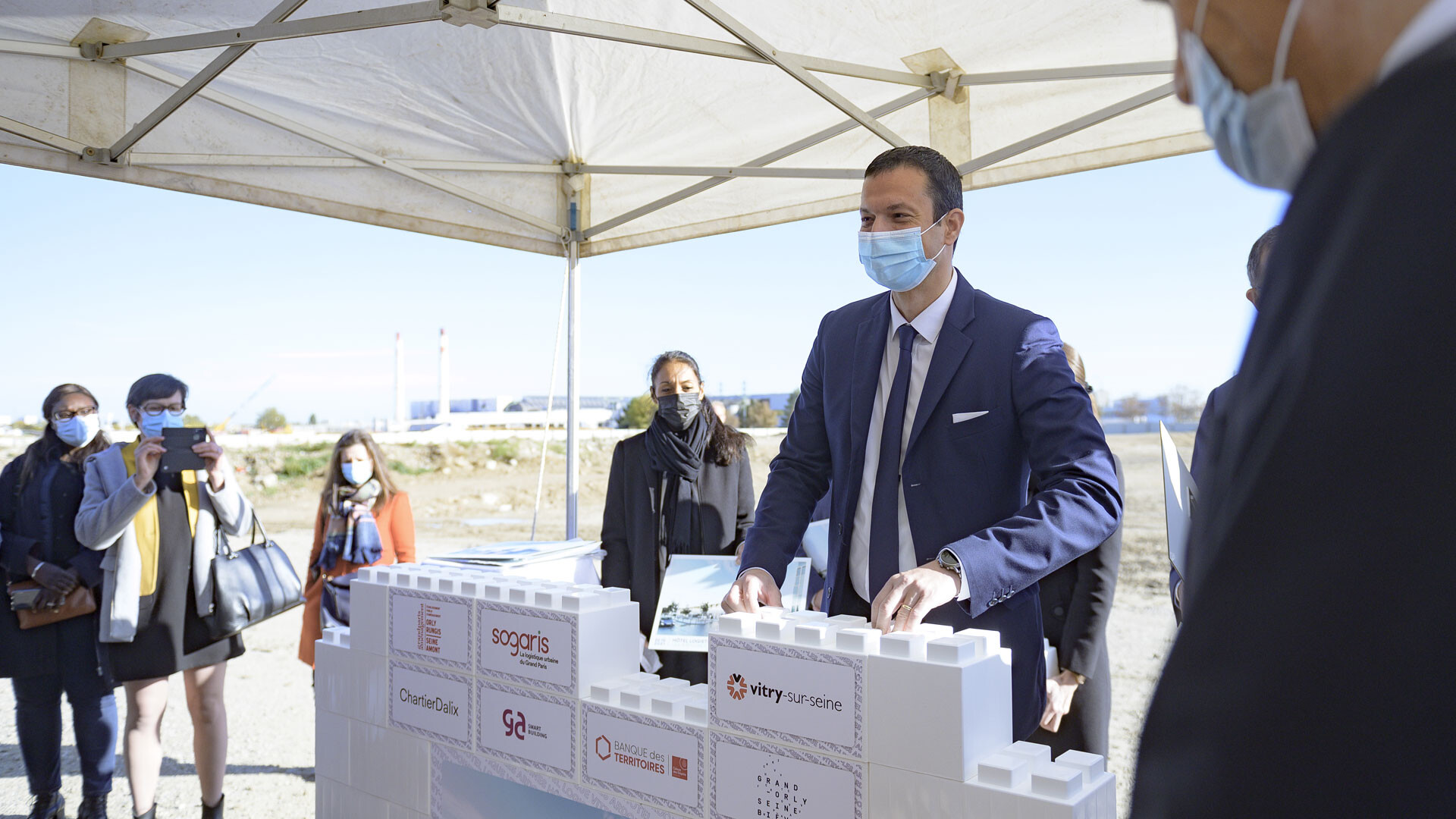 Pause de la première pierre de l’hôtel logistique Sogaris aux Ardoines (Octobre 2021)